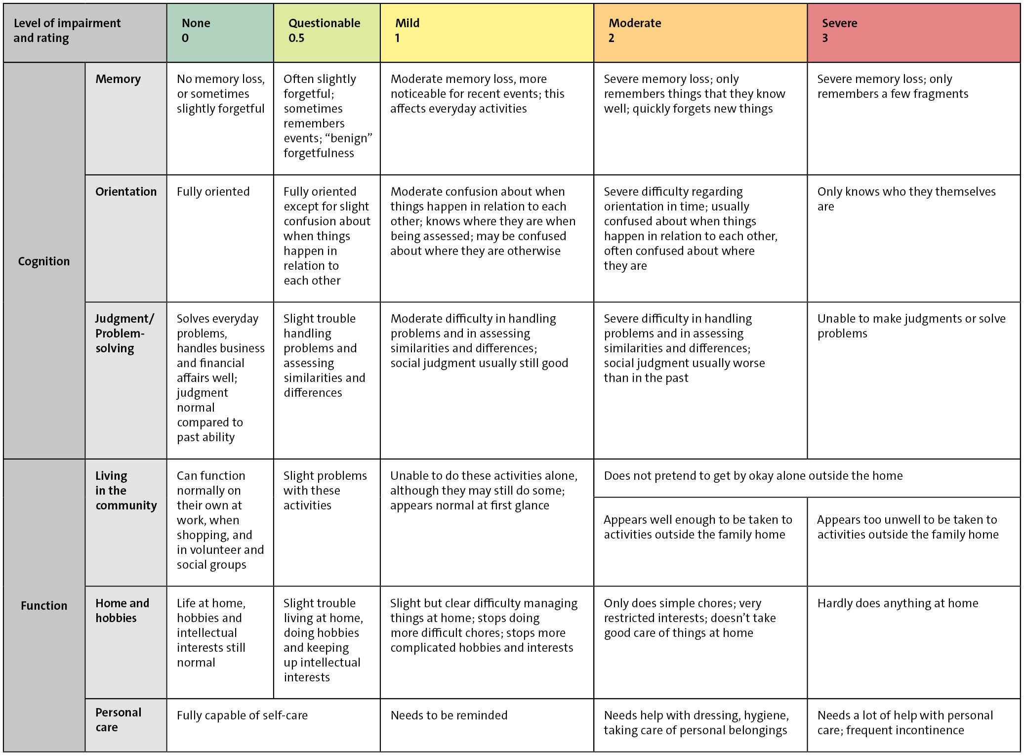 Based on the interview and answers, the doctor gives a score for each category: Is there no impairment or a questionable, mild, moderate or severe impairment? The score for no impairment ("none") is 0, and the score for a severe impairment is 3.